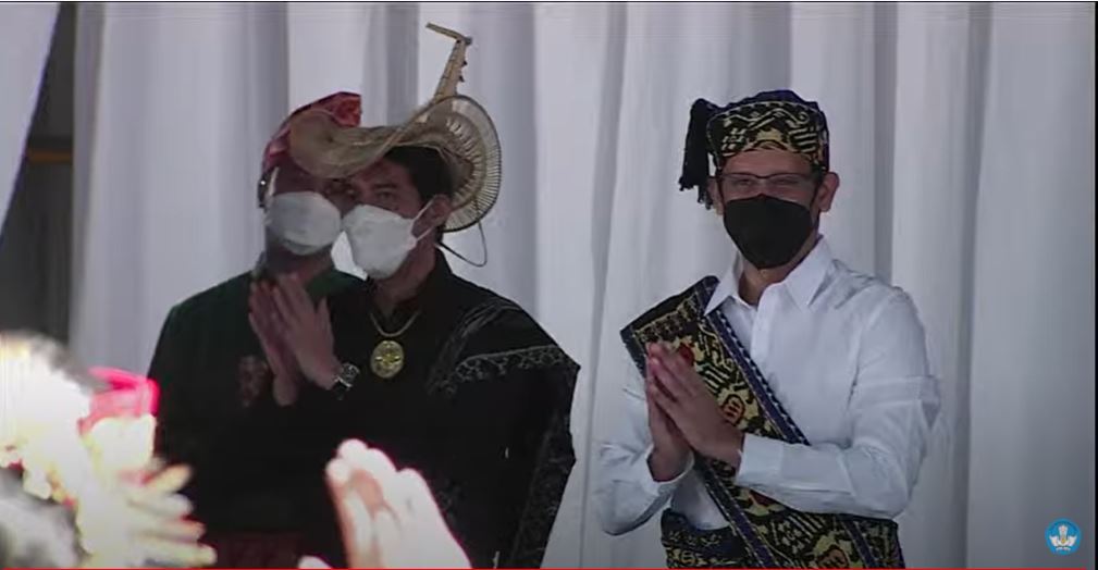 Bertindak sebagai Pembina Upacara, Menteri Pendidikan, Kebudayaan, Riset, dan Teknologi (Mendikbudristek) Bapak. Nadiem Anwar Makarim mengenakan pakaian adat dari Flores, Nusa Tenggara Timur. Menteri Nadiem menjelaskan tema peringatan Hardiknas, yakni “Pimpin Pemulihan, Bergerak untuk Merdeka Belajar”.