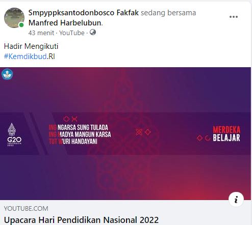 Walaupun Kami Di Pelosok Timur Kab.Fakfak Papua Barat Kami beberapa dewan guru mengikuti rangkaian upacara bendera dalam rangka memperingati Hari Pendidikan Nasional (Hardiknas) tahun 2022 yang dilaksanakan di halaman kantor Kementerian Pendidikan, Kebudayaan, Riset, dan Teknologi (Kemendikbudristek), Lewat Live Streaming Youtube.